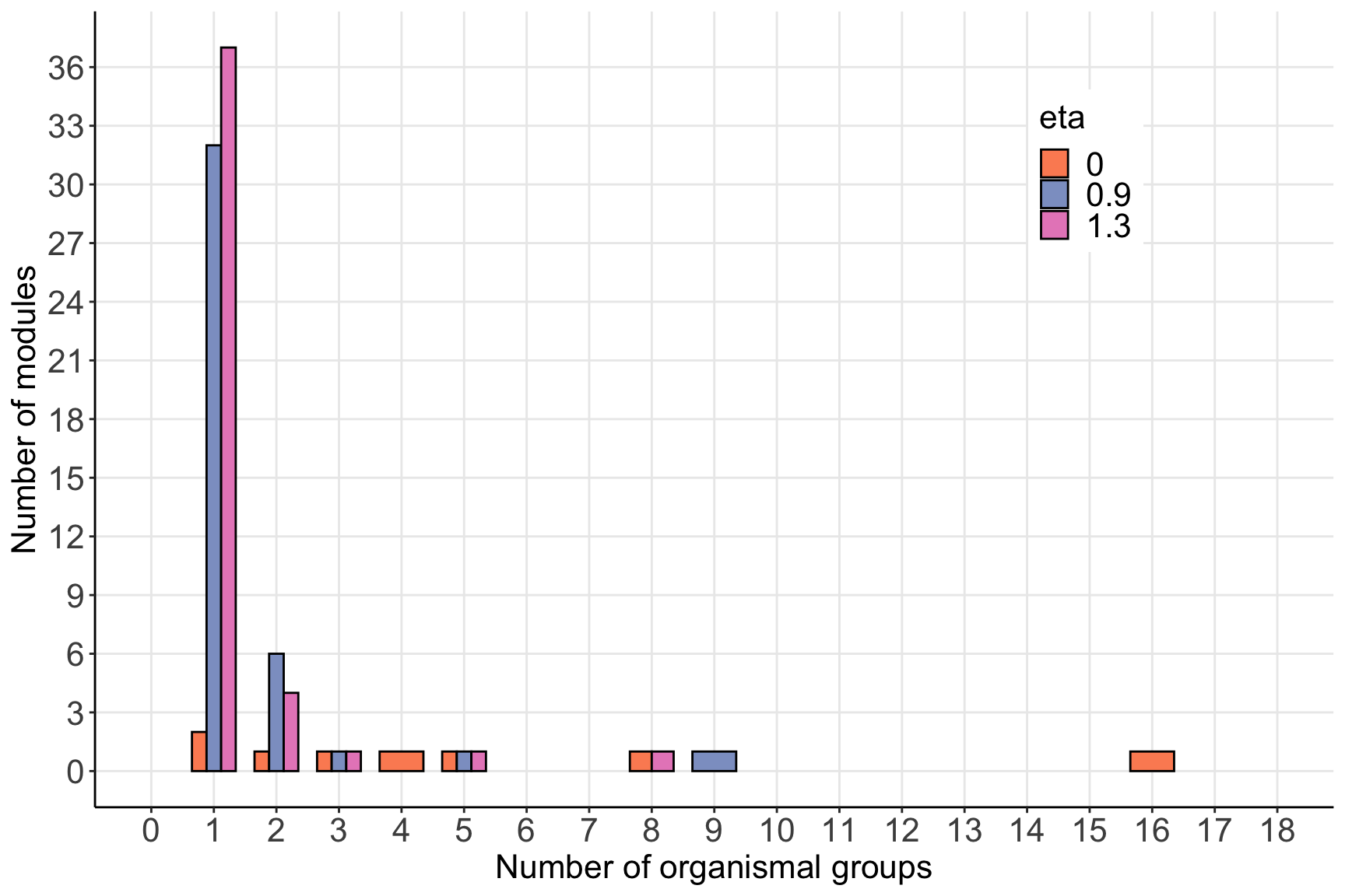 labs(x='Number of organismal groups', y='Number of modules', fill='eta')+